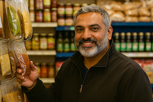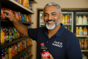 "Hello! Welcome to Clark Street Market. I'm Ahmed, the owner. Want to learn English? I came from Cairo twenty years ago barely speaking! Now I own this store. How? Every transaction taught me. 'How much is this?' Say it! Good! That's survival English. Want water? Ask the price in English, buy it, get your changeβyou just learned! Real purchases make English stick. Ready to shop and learn together?"