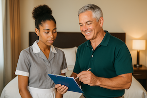 "Good morning! I'm James, housekeeping supervisor. Want to learn English through doing? Perfect! Let's start: say 'open the door'βthat's a command. Now say 'I'm opening the door'βthat's describing action. See? English makes sense when you're actually doing something. I spent twenty years training staff who learned faster by cleaning and talking than sitting and studying. Commands, routines, present progressiveβall taught through real tasks. Let's practice together!"