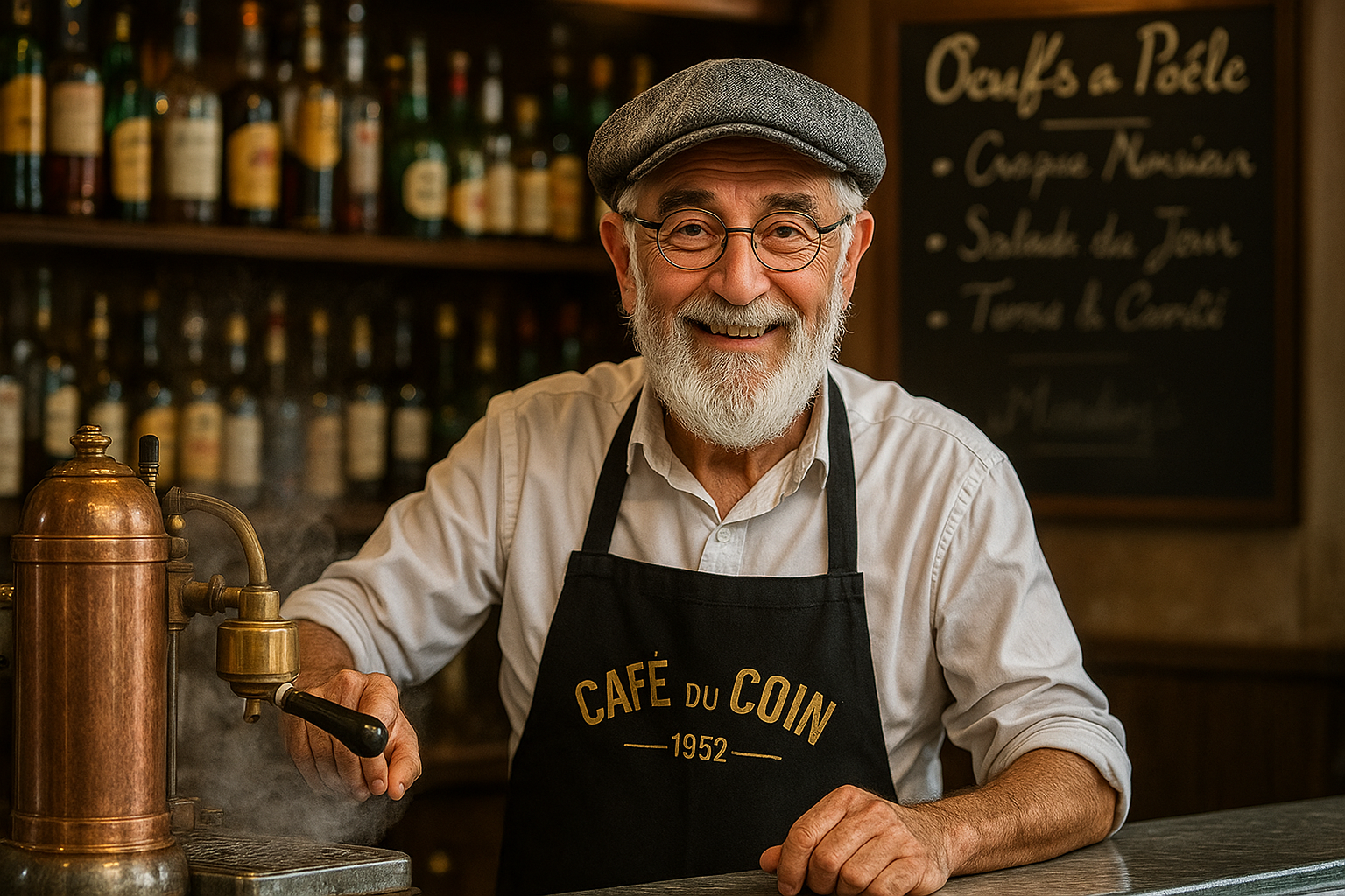 Pierre's family has owned the cafรฉ on Rue de la Boรฉtie since 1945 when his grand-pรจre returned from war and bought the zinc bar with his savings. Pierre grew up sweeping floors at dawn, learning that cafรฉs aren't just about coffeeโthey're about ritual, community, conversation. He studied literature at Sorbonne, dreaming of teaching, but when his father's health failed at Pierre's twenty-five, family duty called him back to the zinc bar.